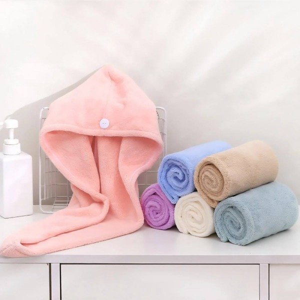Se envuelve alrededor del cabello húmedo y se asegura con un botón, permitiendo que el turbante absorba el agua mientras realizas otras actividades.