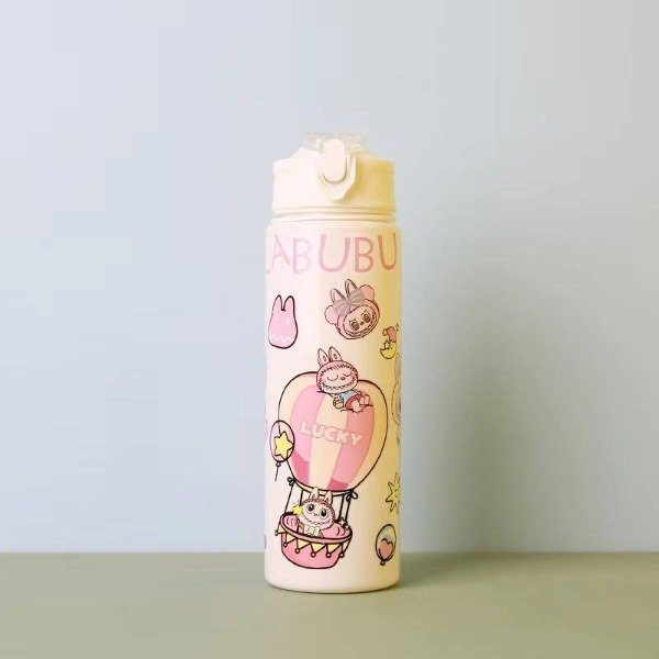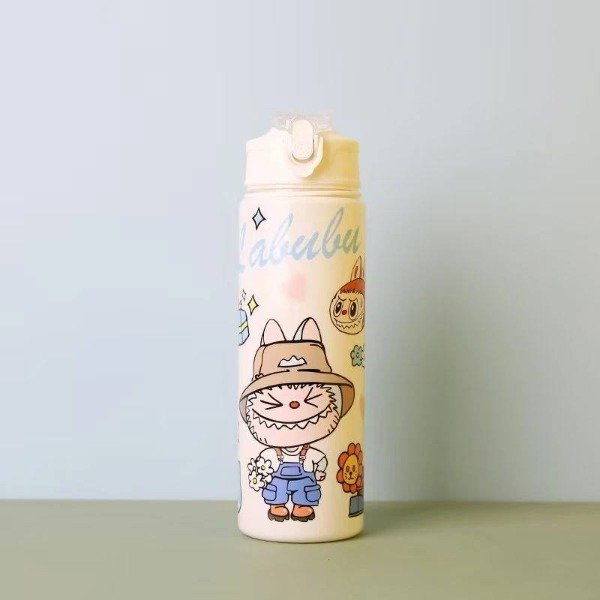 Botella plástica disponible en varios colores con diseño de labubu cuenta con pico, tapa a rosca y una correa para que sea fácil de llevar a cualquier lado