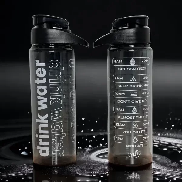 Botella color negro con medidora y frases motivadoras, ideal para los niño para llevarlo a la escuela o simplemente para deportes