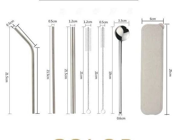La caja incluye: 1 sorbete recto, 1 sorbete curvo,1 sorbete grande, 1 cuchara coctelera, 2 cepillos limpiadores.