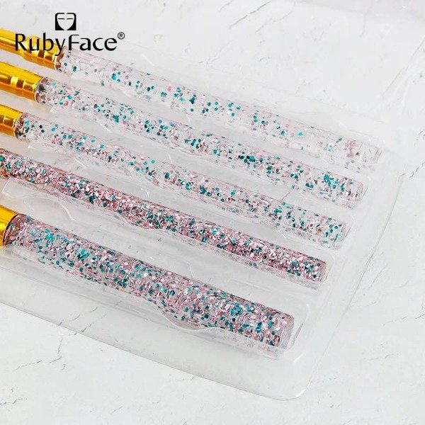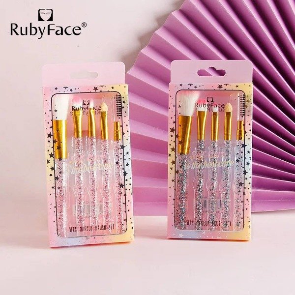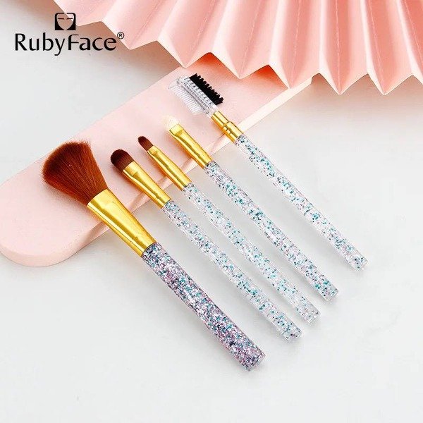Set x 5 Brochas Para Maquillaje , cada uno con mango de plástico y en su punta un acabado de metal que sostienen las cerdas de las brochas. Contiene brochas para rubor, sombra, labial, peine para pestañas.