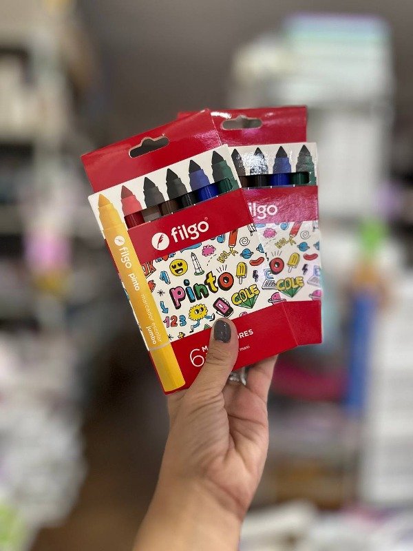 Marcadores de la maca "filgo", la caja trae 6 unidades de colores surtidos, punta maxi de forma cónica que permite trazo fino de 2mm y trazo grueso de 7 mm, la tinta es atoxica a base de agua, también trae capuchón ventilado.