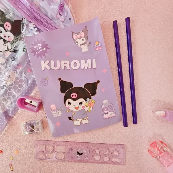 Este kit cuenta con dos lápices, un borrador, un sacapuntas y una regla de 15cm. Cuenta con un estuche con forma de cartera y posee un diseño de "Kuromi" super bonito.