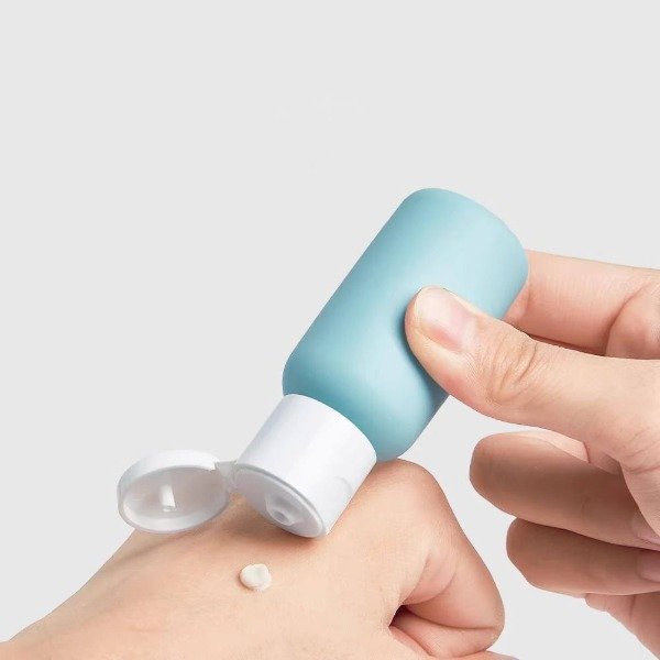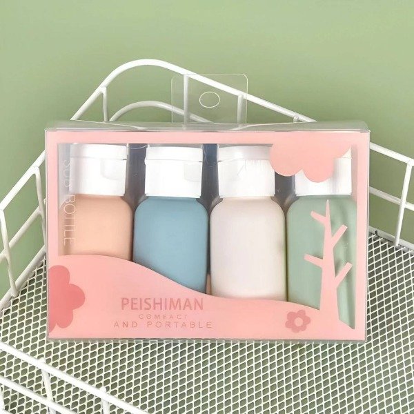Neceser de viaje, que cuenta con 4 envases de diferentes colores que son un material de plástico, ideal para poder sacar el producto fácilmente presionándolo.